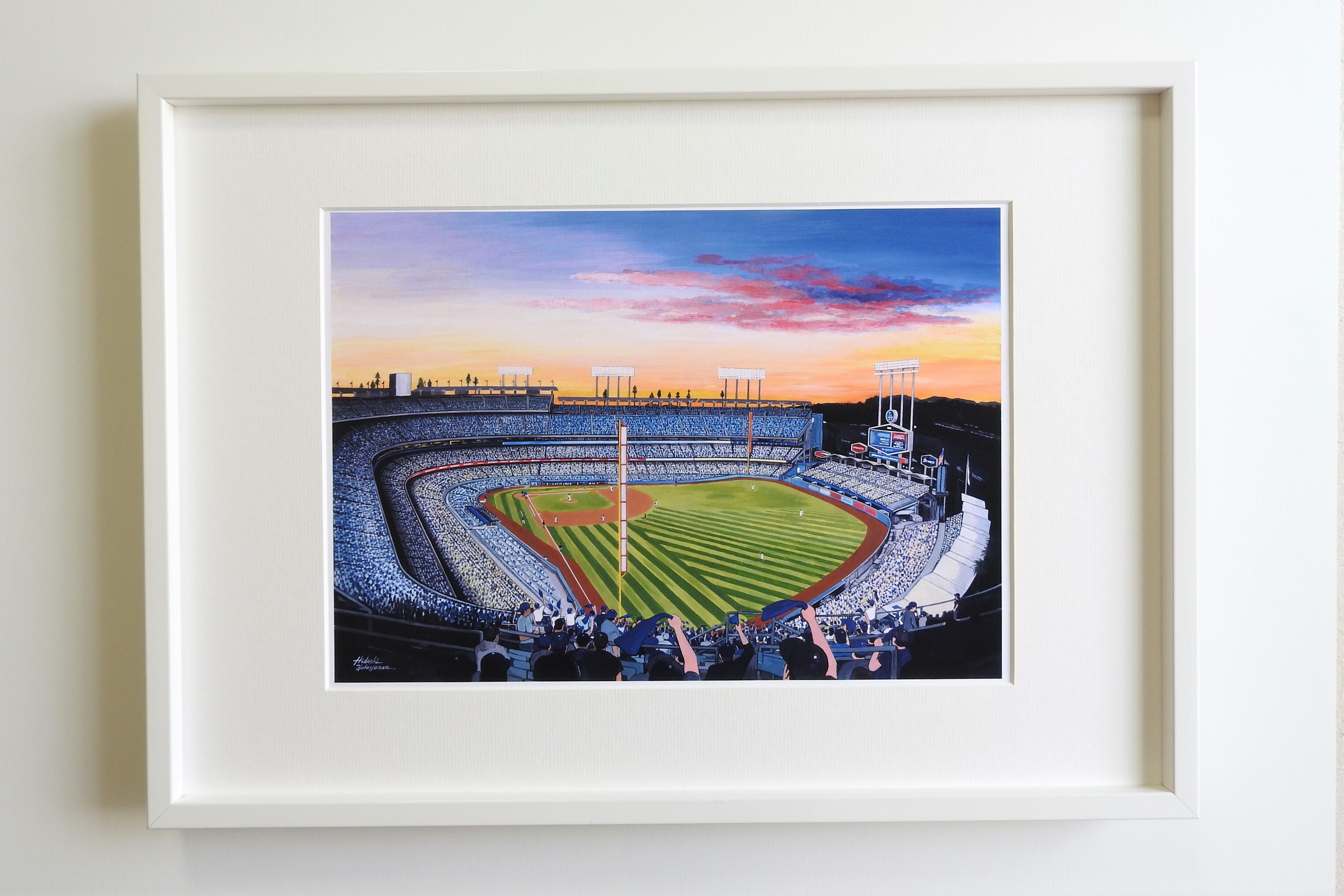 夕日が沈んでいく時間帯のドジャースタジアムをの描いた作品の複製版です。